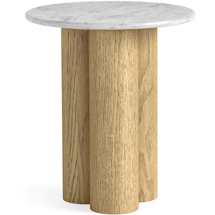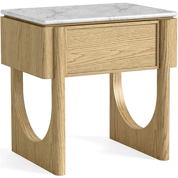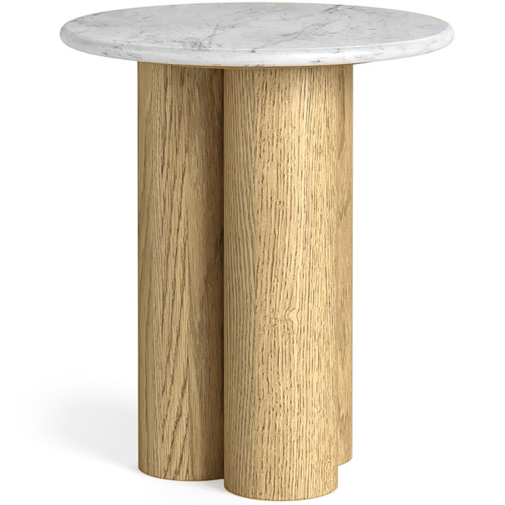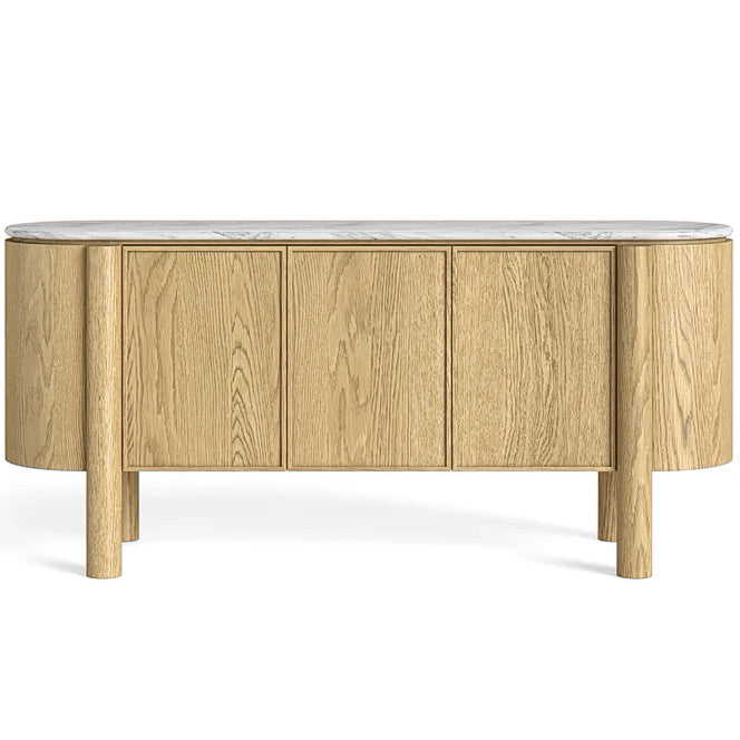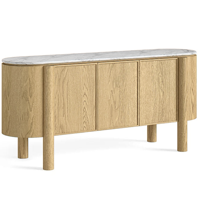 At 1.8m high and 1.2m wide, this bookshelf offers a unique and contemporary take on storage. Four rounded wooden pillars give the piece a soft, architectural feel, while a marble top lends natural elegance above two spacious cupboard doors. Three open wooden shelves complete the design, blending practicality with sculptural style.