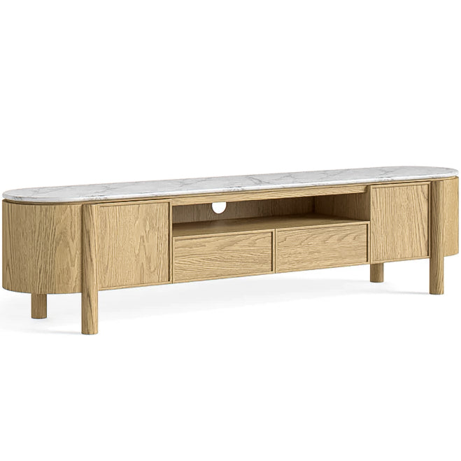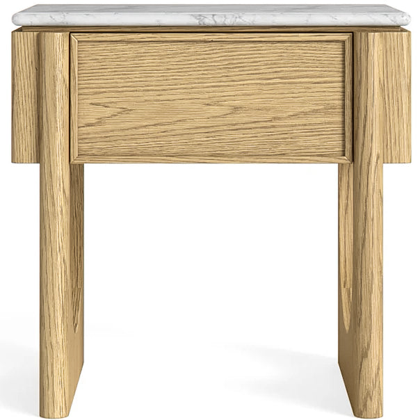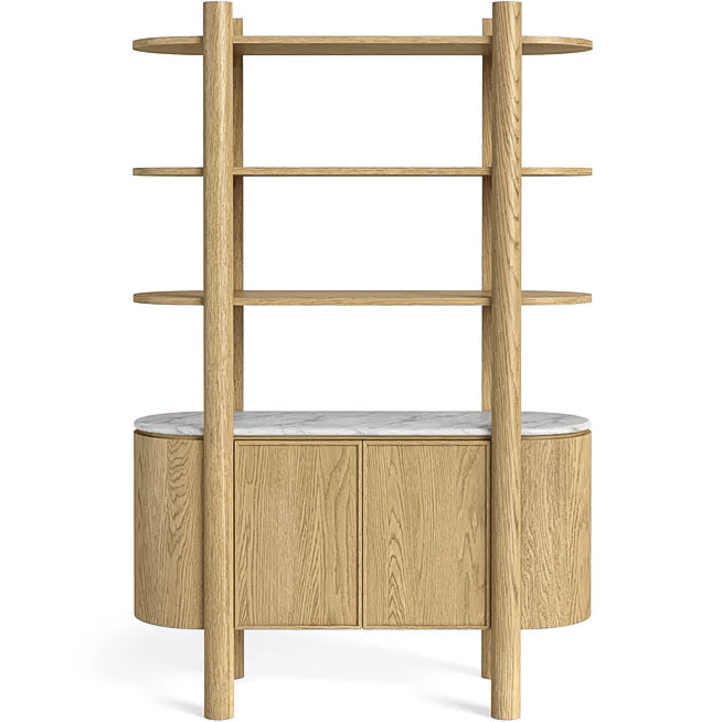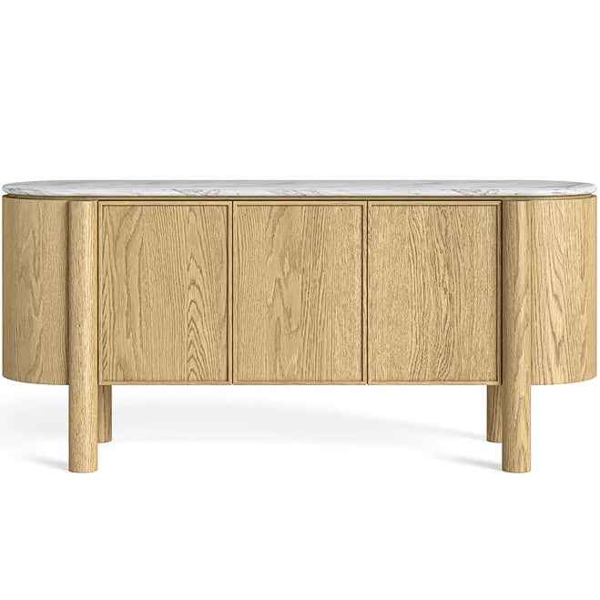 The console table mirrors the soft, contemporary design of the collection. Rounded wooden pillars rise from a squared-off base that runs along the floor, creating gentle curves, and a marble top completes the piece. A single drawer adds practical storage while maintaining its sculptural elegance.